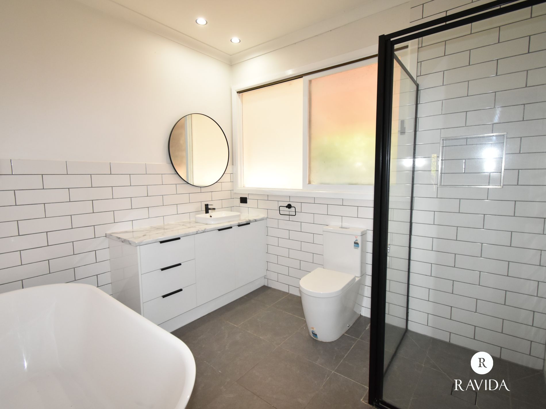 Newly renovated bathroom with bath, shower, toilet and vanity