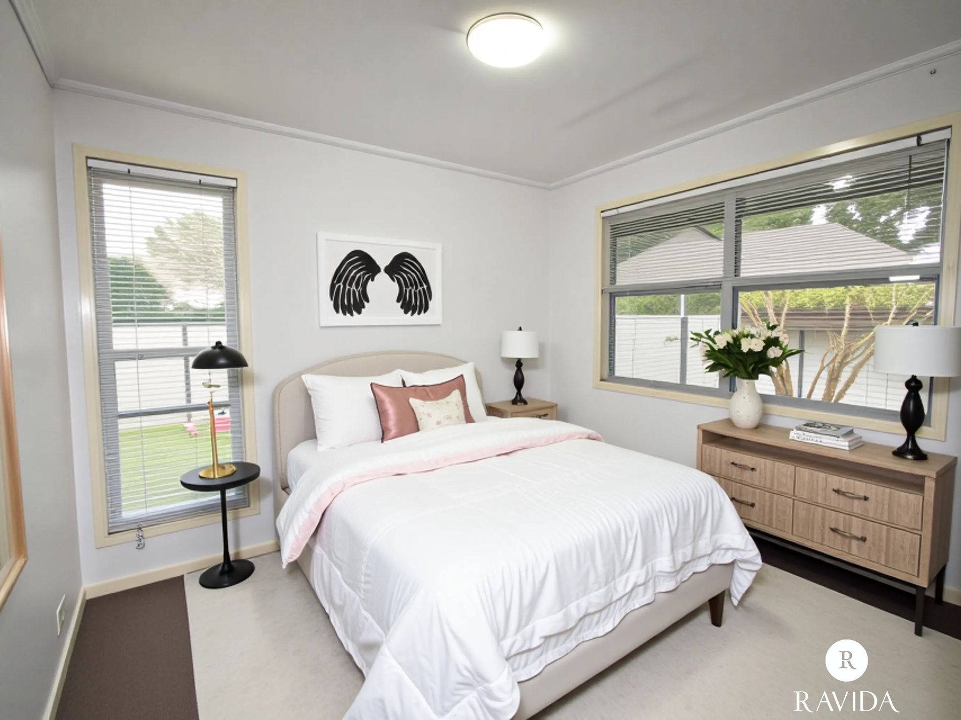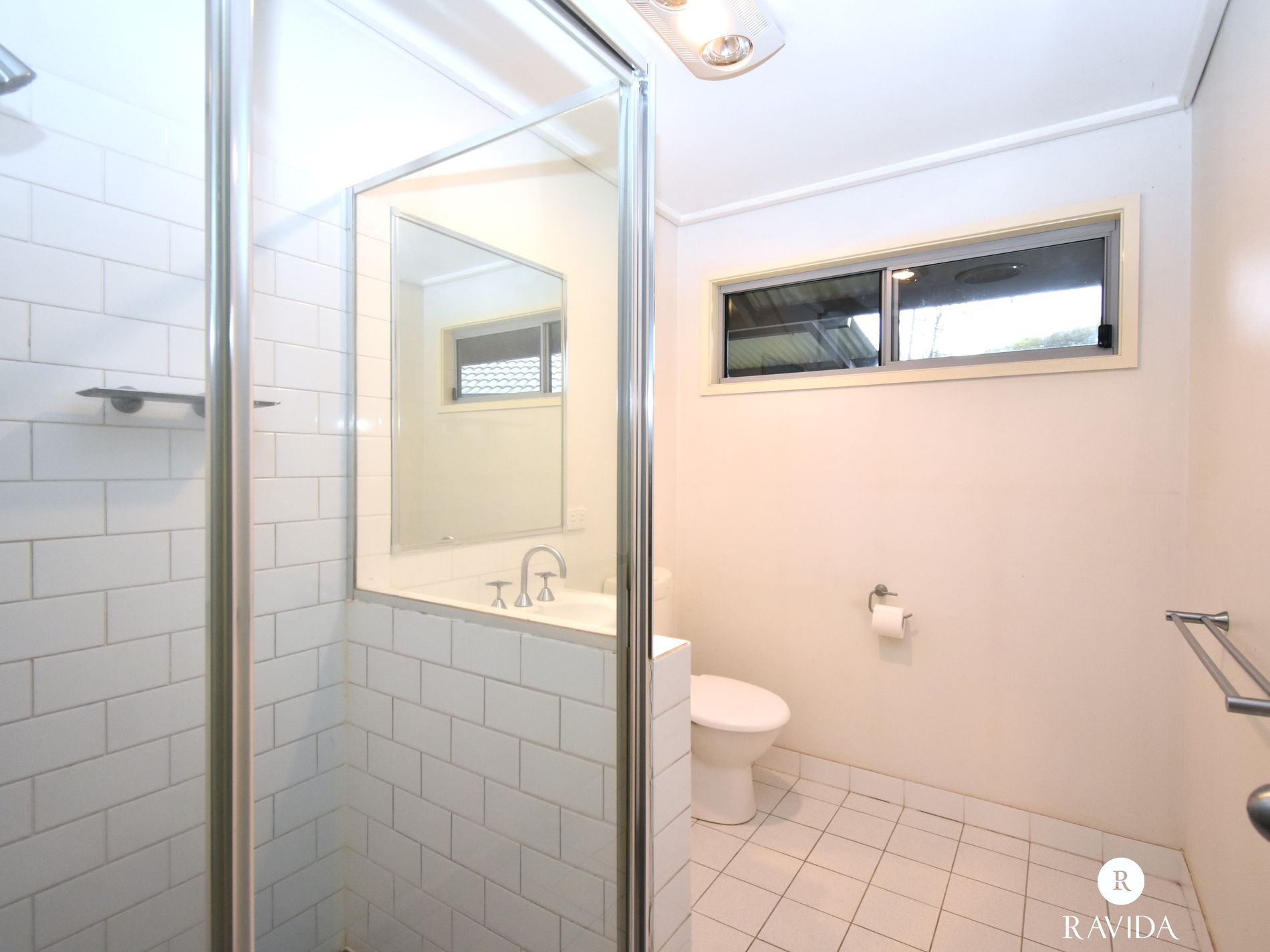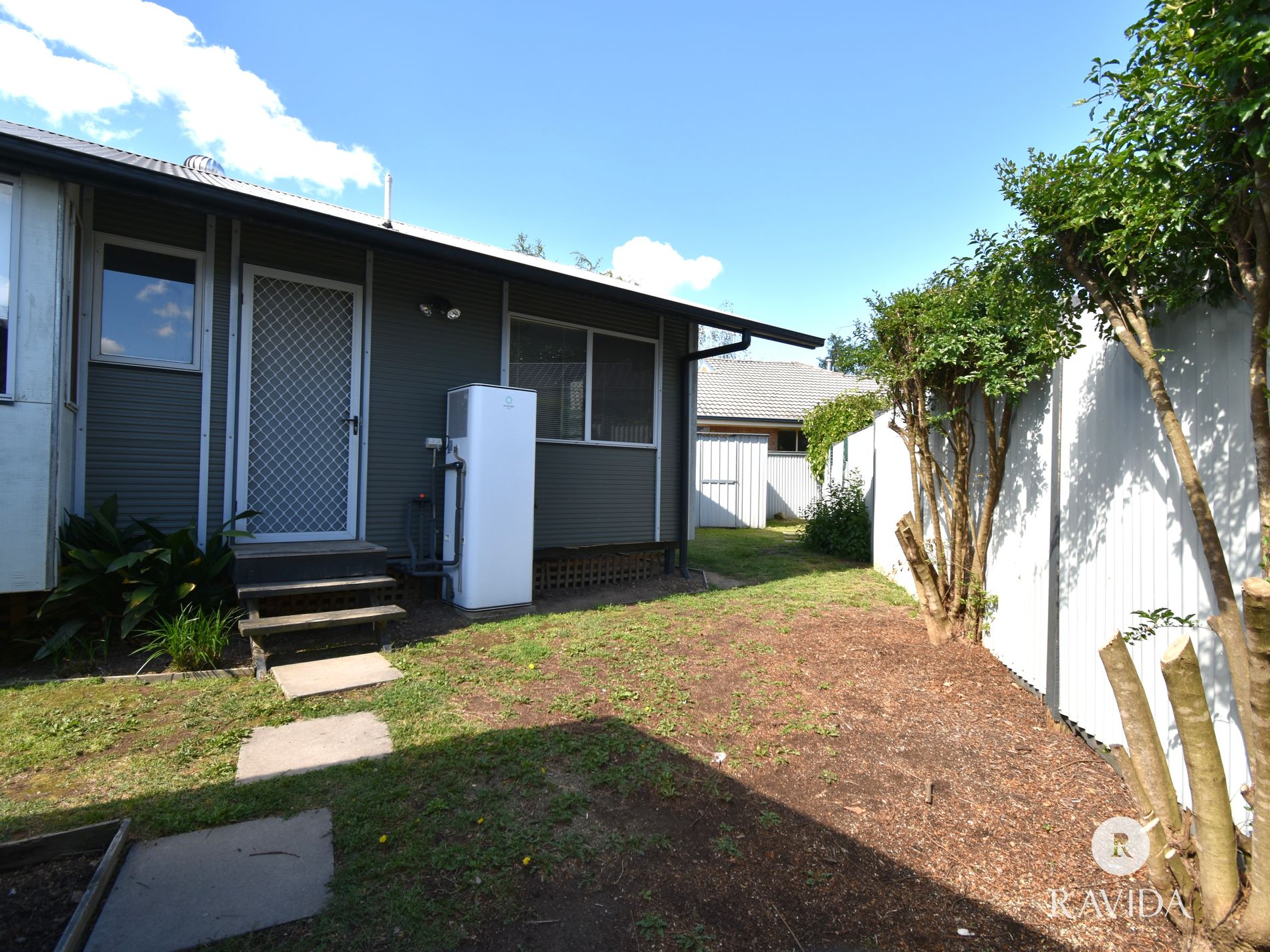 Heating and cooling is provided by a split system unit and two ceiling fans.