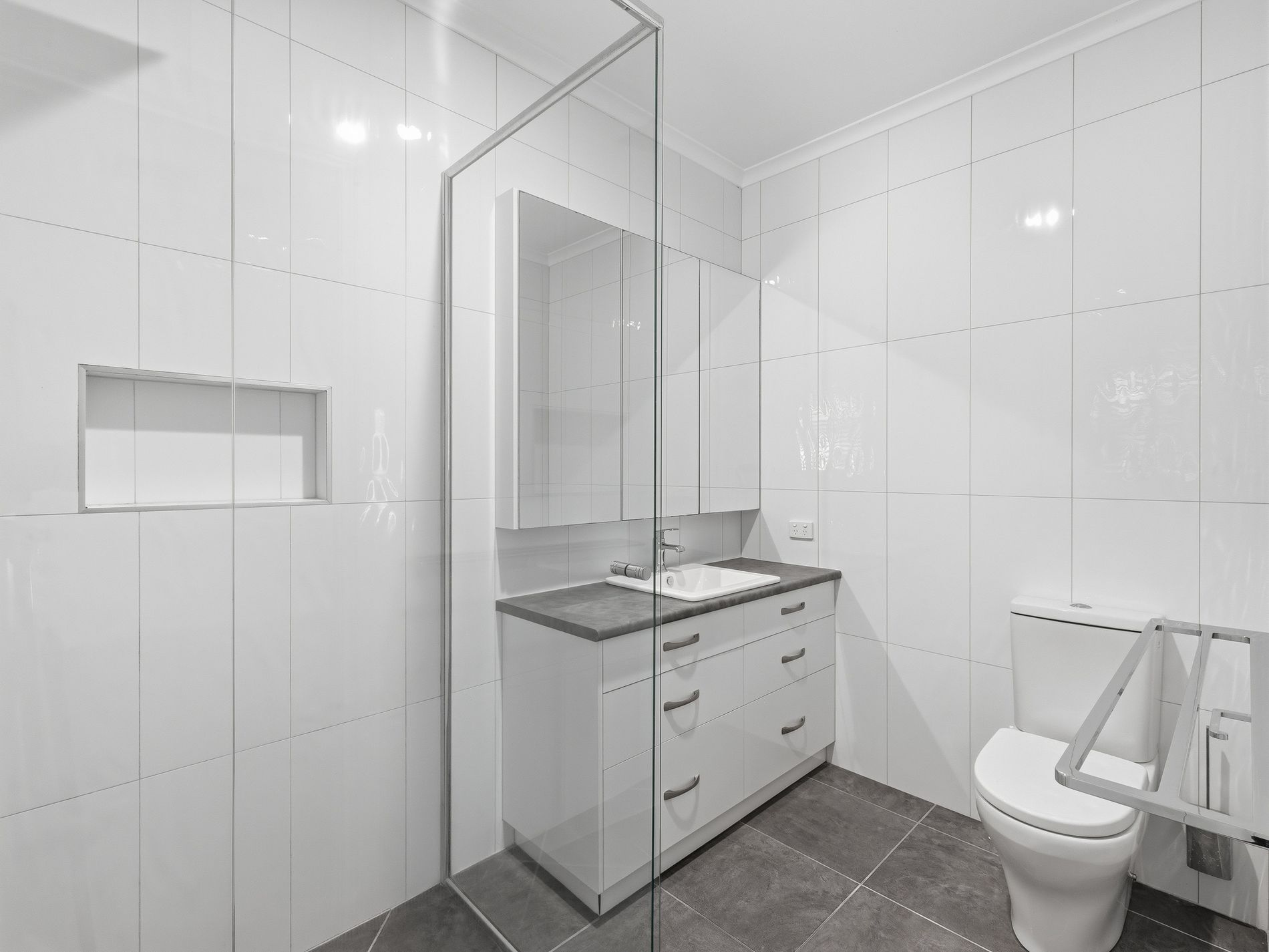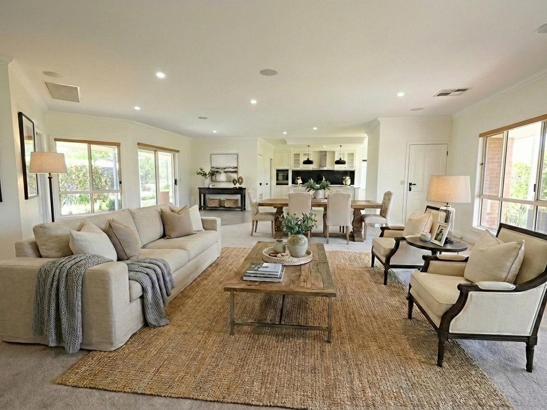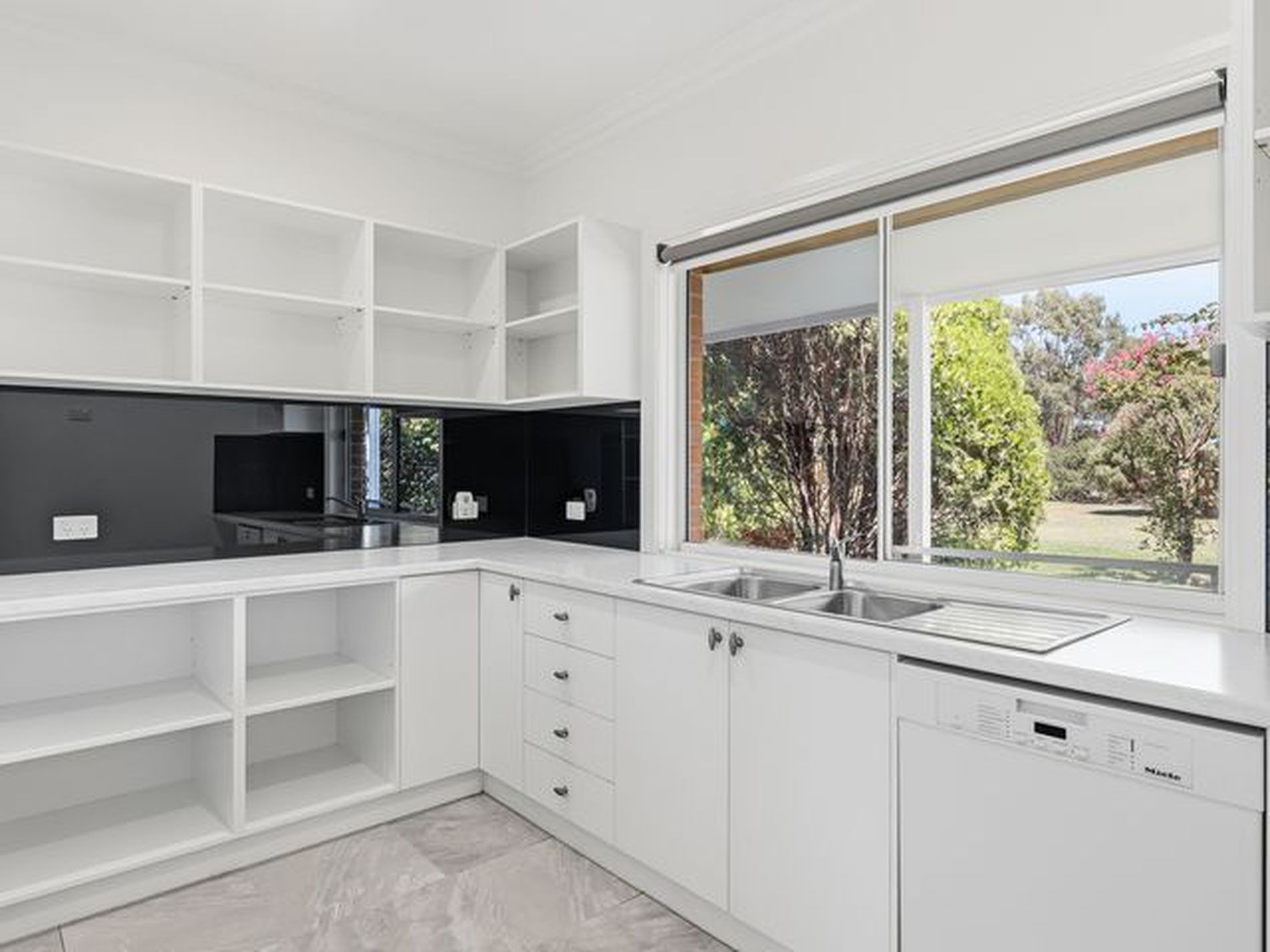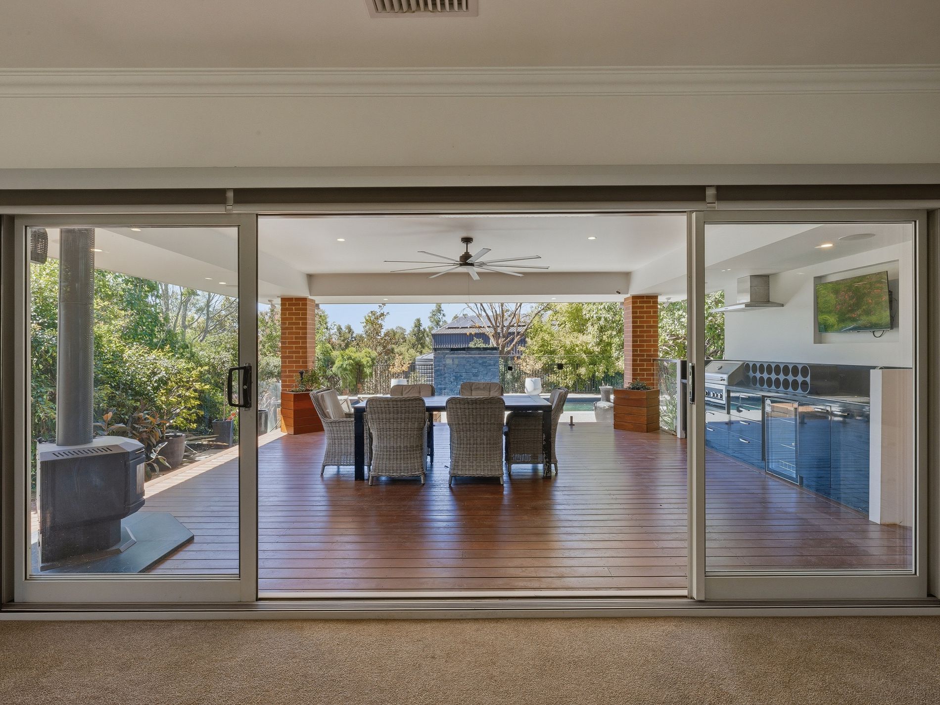 The expansive main living area features built-in TV cabinetry with feature lighting, electronic roller blinds, and double-glazed stacker doors with retractable flyscreens that seamlessly connect indoors to out.