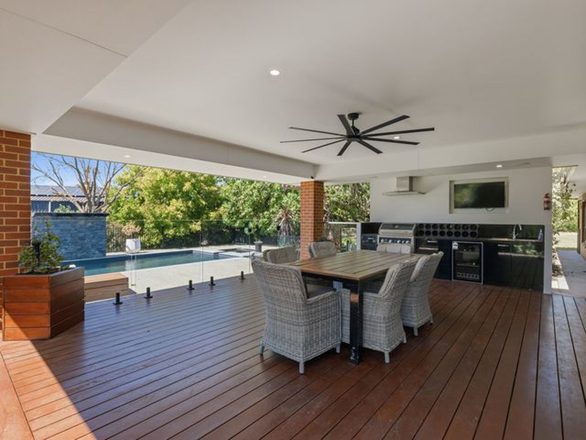 With direct access off the main living area the impressive north-facing entertaining area is complete with spotted gum decking, slow combustion wood heater, large ceiling fan, radiant heater and a full outdoor kitchen including sink, BBQ, rangehood, fridge and TV. Overlooking the solar heated, inground pool and spa, this space is perfect for year-round entertaining.